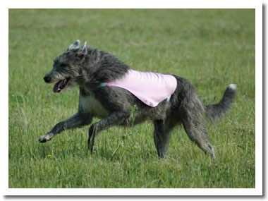 Because of his great size and the amount of exercise essential to his well-being, the Irish Wolfhound is not a dog to be acquired without serious fore-thought. His ideal home is one which provides fenced property of sufficient size to accommodate the galloping natural to this athletic sight hound. Hunting by sight and chase is what he was bred and historically used for; the length of leg and back, the deep chest, the power of his limbs and body attest to the heritage and needs of the Irish Wolfhound.